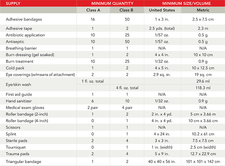 ANSI/ISEA标准的修订版Z308.1-2015于2016年6月生效,并引入了两类急救箱。这些装备分为“A类”和“B类”,根据供应品的数量和分类而定。
